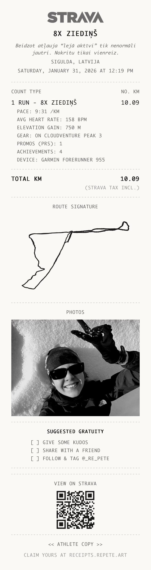 PagÄÅ”nedÄļ sÄkumÄ paskatÄ«jos laika prognozes, paskatÄ«jos uz žļurgaino ietvi un paÅÄmu trenažieru zÄles abonamentu. NUINAFIG. Ziema skaista, forÅ”a, izbaudÄ«ta, bet gana. SkrieÅ”u uz skrejceļa. Un tad pienÄk sestdiena, aizbraucu uz Siguldu, tieku pie sava paÅ”a mīļÄkÄ treniÅa (noskrÄjieni - aktÄ«vi) un viss ir lieliski. Ziema ir skaista, varu maukt bez mentÄlÄ bloka lejÄ pa ZiediÅu un lai jau tÄ ziema paliek. IzrÄdÄs, ka man vienkÄrÅ”i vairs nepatÄ«k ziema RÄ«gÄ. TÄ, lÅ«k.